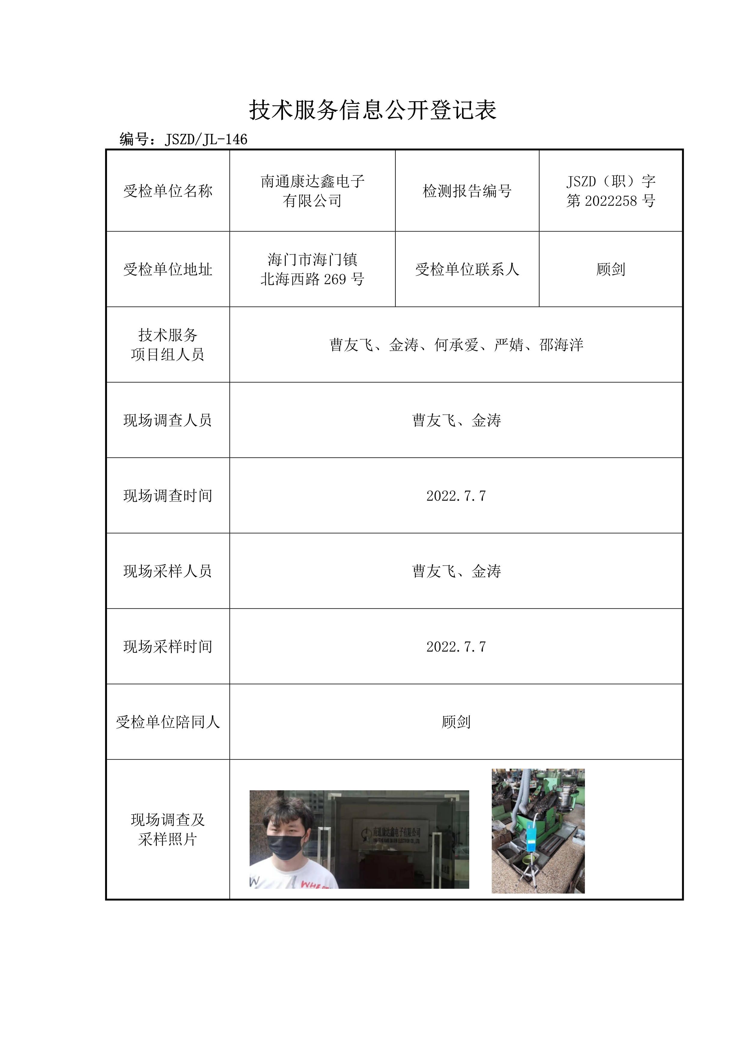 2021-2022南通地區(qū)檢驗檢測項目公開——正大JSZD(職)字第2022258號南通康達(dá)鑫電子有限公司職業(yè)病危害因素檢測報告